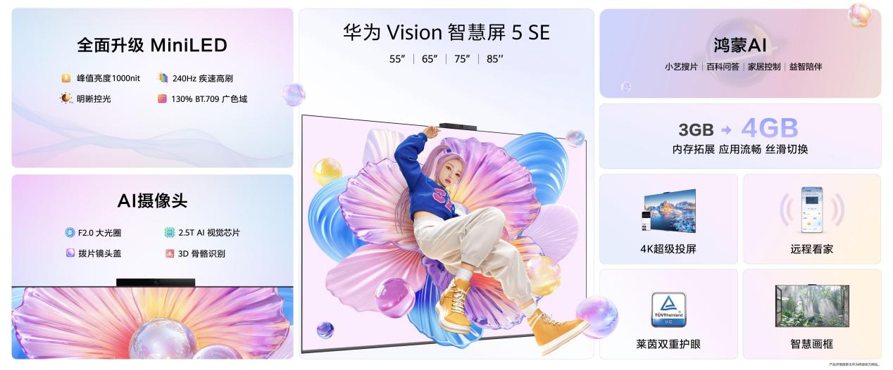 華為Vision智慧屏 5 SE作為Vision系列的一員,同樣具備出色的性能。4K超級投屏,鴻蒙AI,240Hz MiniLED 超清護眼,AI攝像頭等核心優勢,使其成為兩千檔價位段、擁有超高品價比的MiniLED“巨幕手機”。其搭載的MiniLED技術,能夠實現精準控光,帶來高對比度和高亮度的畫面效果。無論是觀看電影、電視劇還是玩遊戲,華為Vision智慧屏 5 SE都能為用户帶來清晰、細膩、生動的視覺體驗。