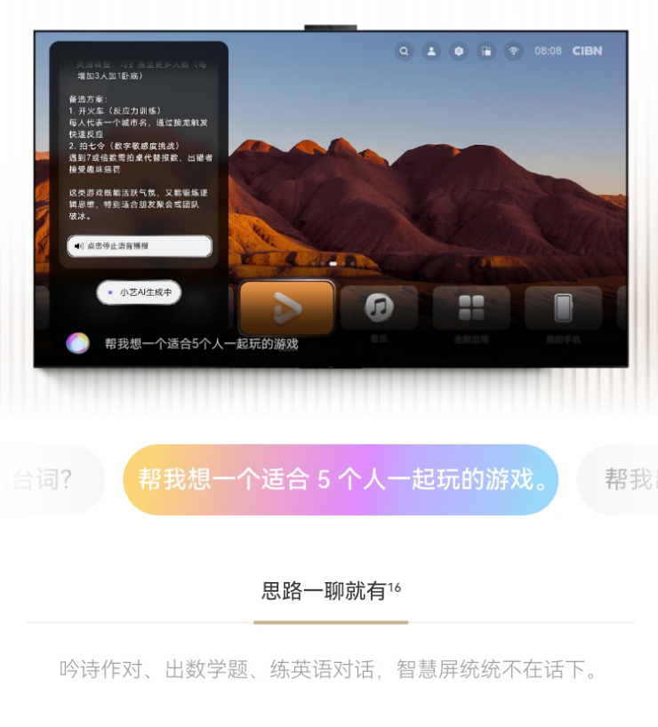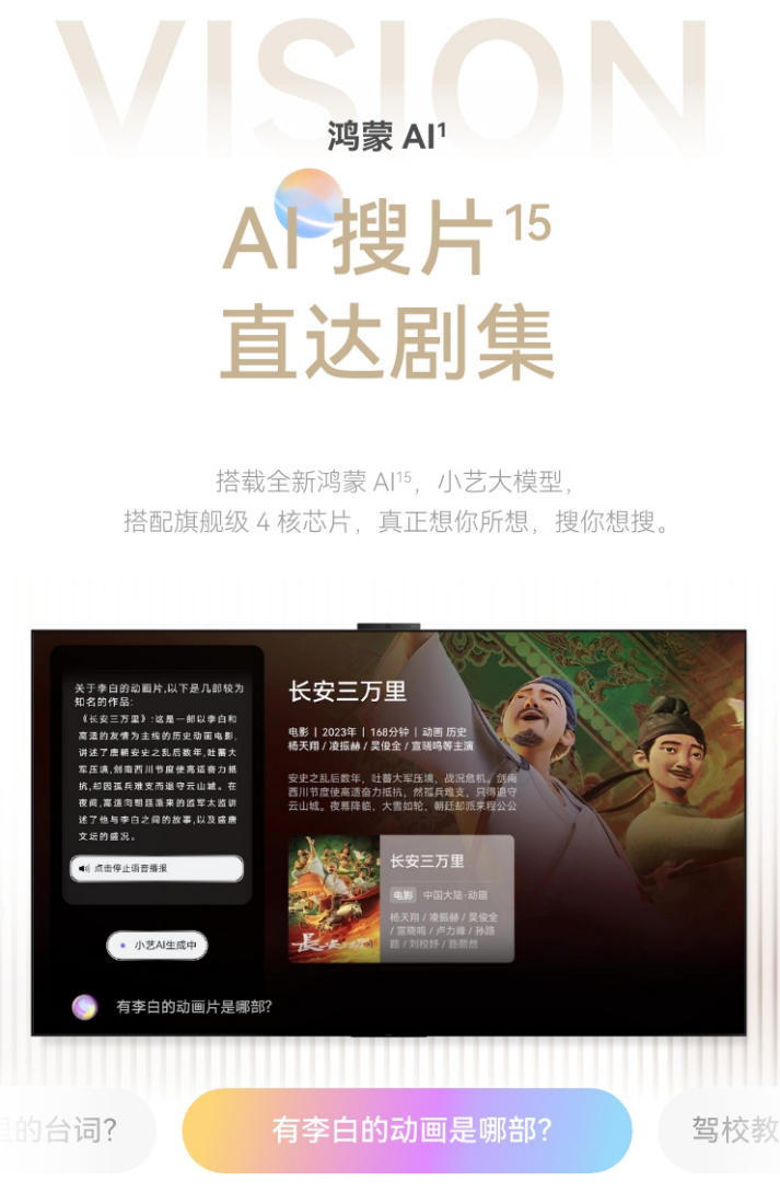 對年輕人來説,打開電視卻不知道看什麼節目是常有的事。華為Vision智慧屏 5的AI搜片功能,能夠從角色、台詞、劇情多個維度搜索劇集,並且精準展示搜索結果。比如,用户只記得某部電影中有一個角色經常説“我命由我不由天”,通過華為Vision智慧屏 5的AI搜片功能,就能快速找到這部電影是《哪吒之魔童降世》,讓用户輕鬆找到自己想看的內容。再例如,在短視頻上刷到一些劇集的解説,從而想看整部劇。只需對着華為Vision智慧屏 5描述出自己感興趣的劇情,電視就能快速找到相關劇集。
