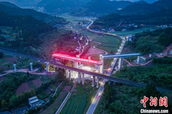 中新網南充4月16日電 (記者 劉忠俊)4月16日凌晨,經過115分鐘的緊張作業,新建的成都至達州至萬州高速鐵路(以下簡稱“成達萬高鐵”)大通鎮跨達成鐵路特大橋,總重量達11000噸的轉體梁逆時針旋轉44度,安全順利到達指定位置,成功完成上跨運營繁忙的達成鐵路施工作業。