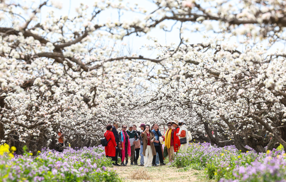 2025年4月5日,遊客在河北省晉州市周家莊鄉第九生產隊梨園內踏青賞花。新華社發(樑子棟 攝)