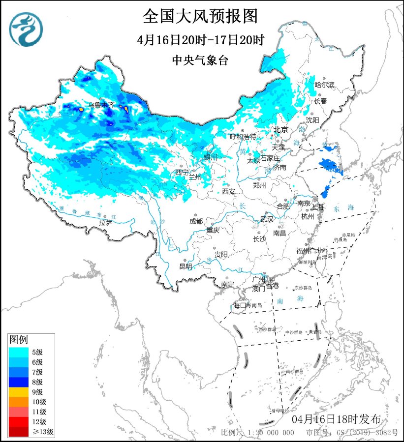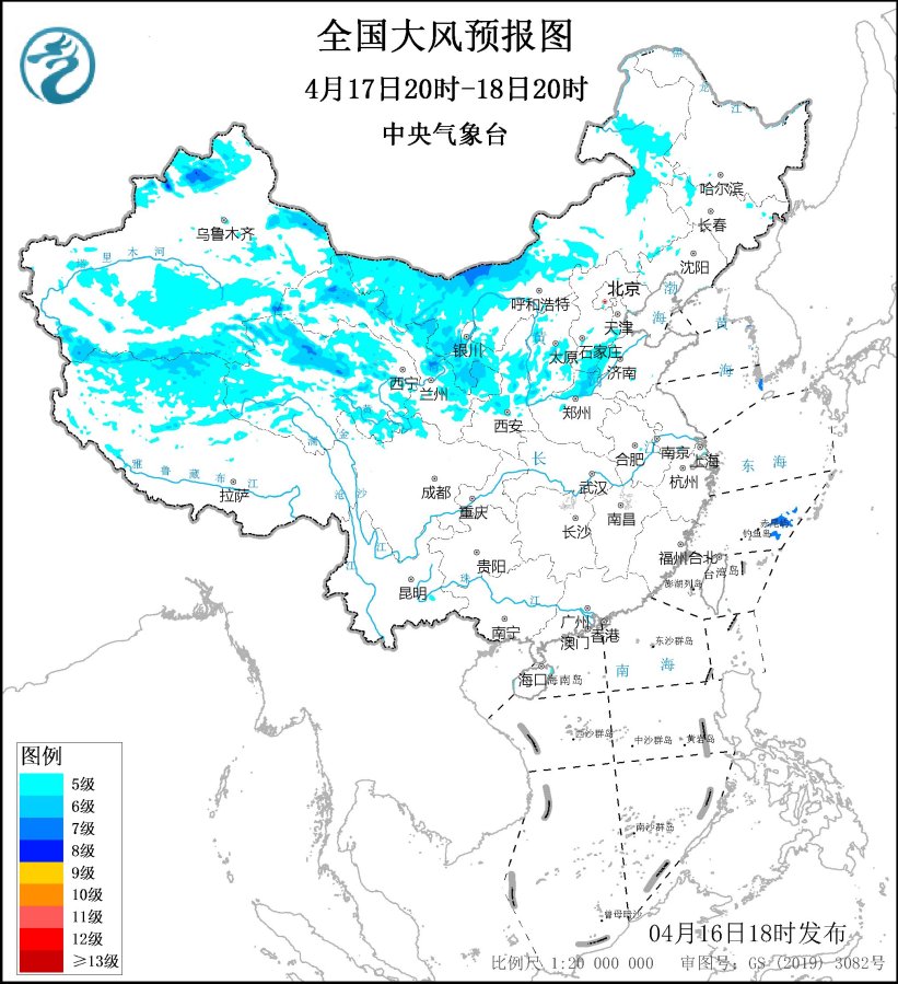 4月17日20時至18日20時,內蒙古中西部和東北部、新疆西北部和東部及南疆盆地、西藏西部、青海北部和西部、甘肅河西和東部、寧夏、陝西中北部、山西中南部、河北南部、河南北部等地大部有5~6級、陣風7~8級的大風,其中,新疆西北部、青海西部、內蒙古中部等地局地陣風可達9~10級。