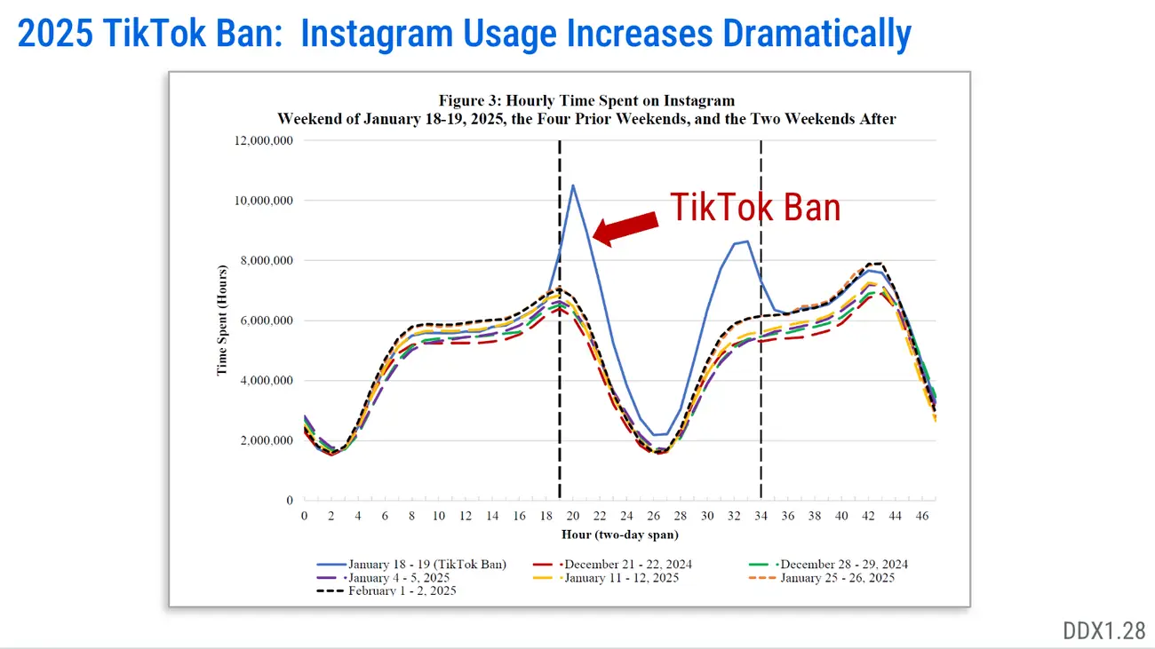 這張圖表來自Meta88頁的演示文稿。Meta選取TikTok禁令前四周與後兩週為參照,並以48小時為統計時限進行對比。