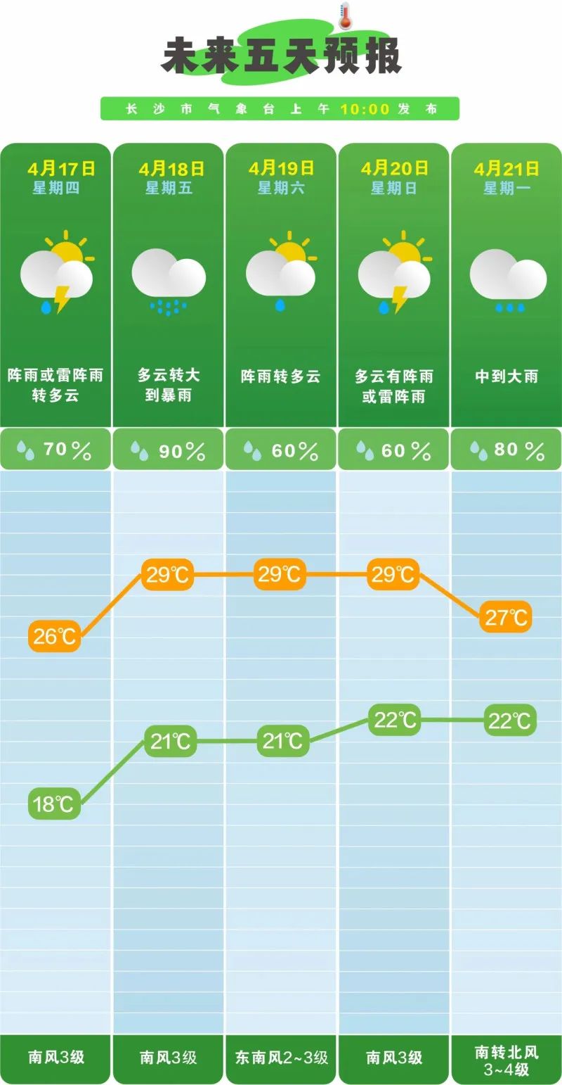 看長沙具體的天氣情況。根據長沙市氣象台發佈的最新天氣預報,預計17日,陣雨或雷陣雨轉多雲,18℃至26℃;18日,高空槽配合低層切變影響,長沙有大到暴雨,並伴有強對流天氣;19日到20日,長沙多陣雨;21日,受高空槽影響,長沙有一次中到大雨過程;22日到23日,多雲為主。