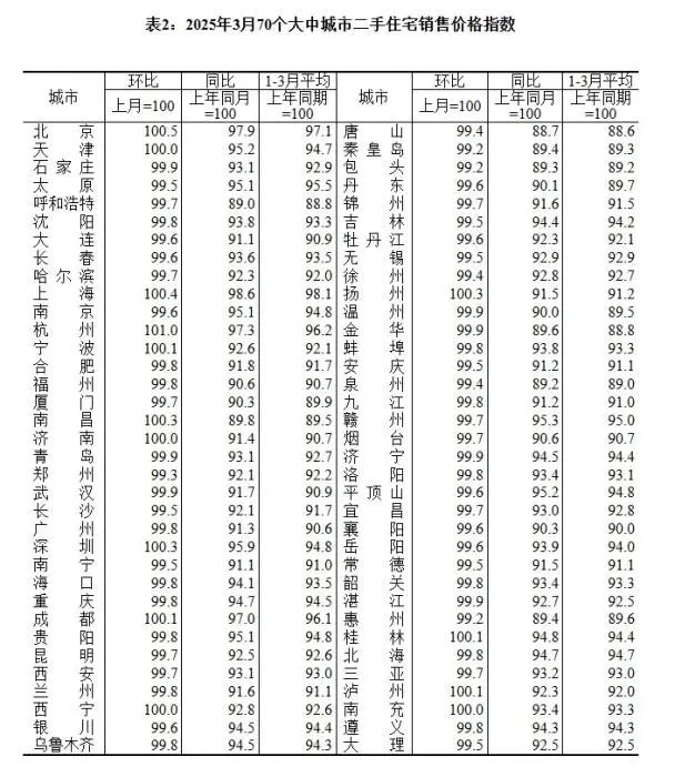 2025年3月70個大中城市二手住宅銷售價格指數。截圖自國家統計局官網