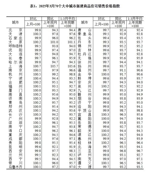 2025年3月70個大中城市新建商品住宅銷售價格指數。截圖自國家統計局官網