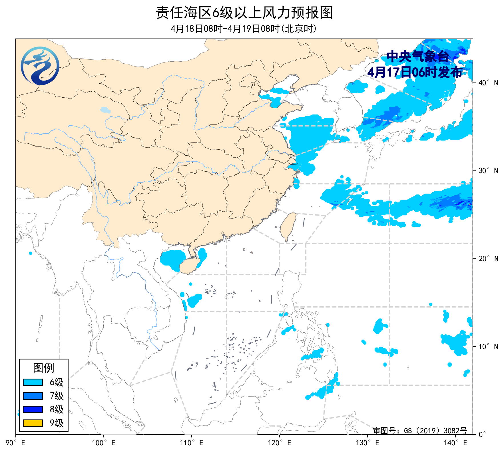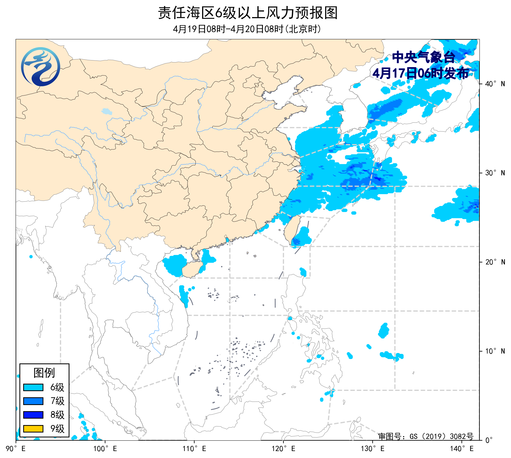 19日08時至20日08時,黃海南部海域將有5~6級、陣風7級減弱到4級以下的偏南風,東海大部海域、台灣以東洋麪將有4~6級、陣風7級的偏南到西南風。