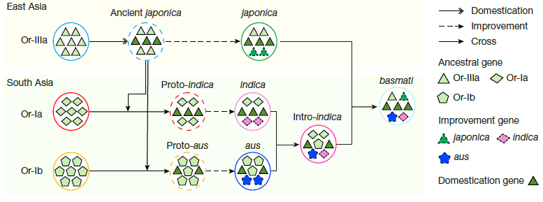 基於高質量的基因組序列,對亞洲栽培稻各類羣中的早期關鍵馴化基因進行單倍型分析,證明所有亞洲栽培稻的馴化位點均來源於粳稻祖先Or-IIIa,進一步證實了亞洲栽培稻單起源假説,為持續數十年的學術爭議提供了關鍵證據。此外,研究還發現在南亞各栽培稻類羣之間存在廣泛的基因交流,並由此定義了一個新的栽培稻亞羣intro-indica,成功繪製了一幅全面的水稻進化和馴化路線圖。