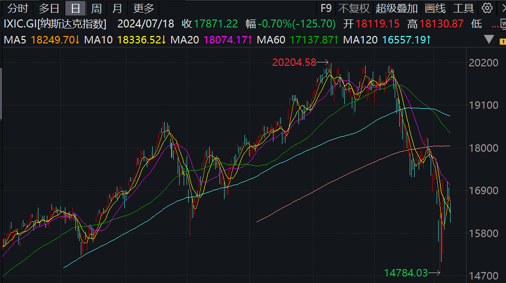 受上述信息影響,美國三大股指全線收跌,道指跌1.73%報39669.39點,標普500指數跌2.24%報5275.7點,納指跌3.07%報16307.16點。英偉達跌超6%,安進跌逾4%,領跌道指。萬得美國科技七巨頭指數跌4.07%,特斯拉跌超4%,蘋果跌逾3%。