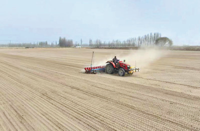 金色的沙海邊緣,塔克拉瑪干沙漠的風裹挾着細沙掠過,一台台播種機在廣袤的田地上轟鳴前行,揚起片片塵土。開溝器劃開乾燥的土壤,將一粒粒經過包衣處理的水稻種子精準埋入地下。覆土輪將它們輕輕壓實,在鬆軟的土壤上留下淺淺的整齊痕跡。