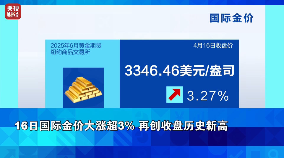 從風險資產撤離的資金繼續湧向黃金避險,加之美元指數週三下跌,國際金價當天大漲超3%,首次收於每盎司3300美元關口上方,再次創下收盤歷史新高。截至收盤,紐約商品交易所6月黃金期價收於每盎司3346.46美元,漲幅為3.27%。