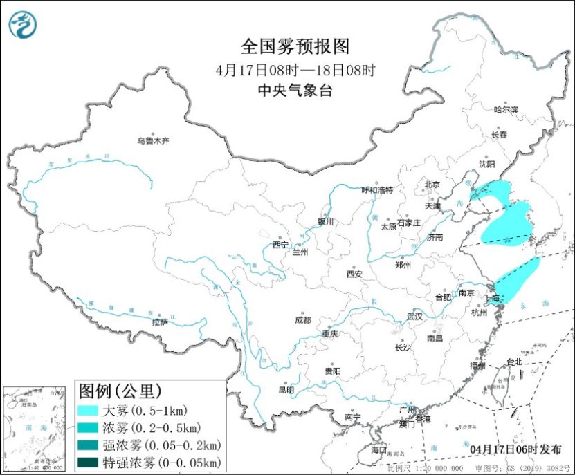 4月17日白天至夜間,黃海北部和中部海域、東海西北部海域、長江口及杭州灣附近海域、舟山羣島附近海域、大連港、上海港、寧波港將有能見度不足1公里的大霧(見圖3)。