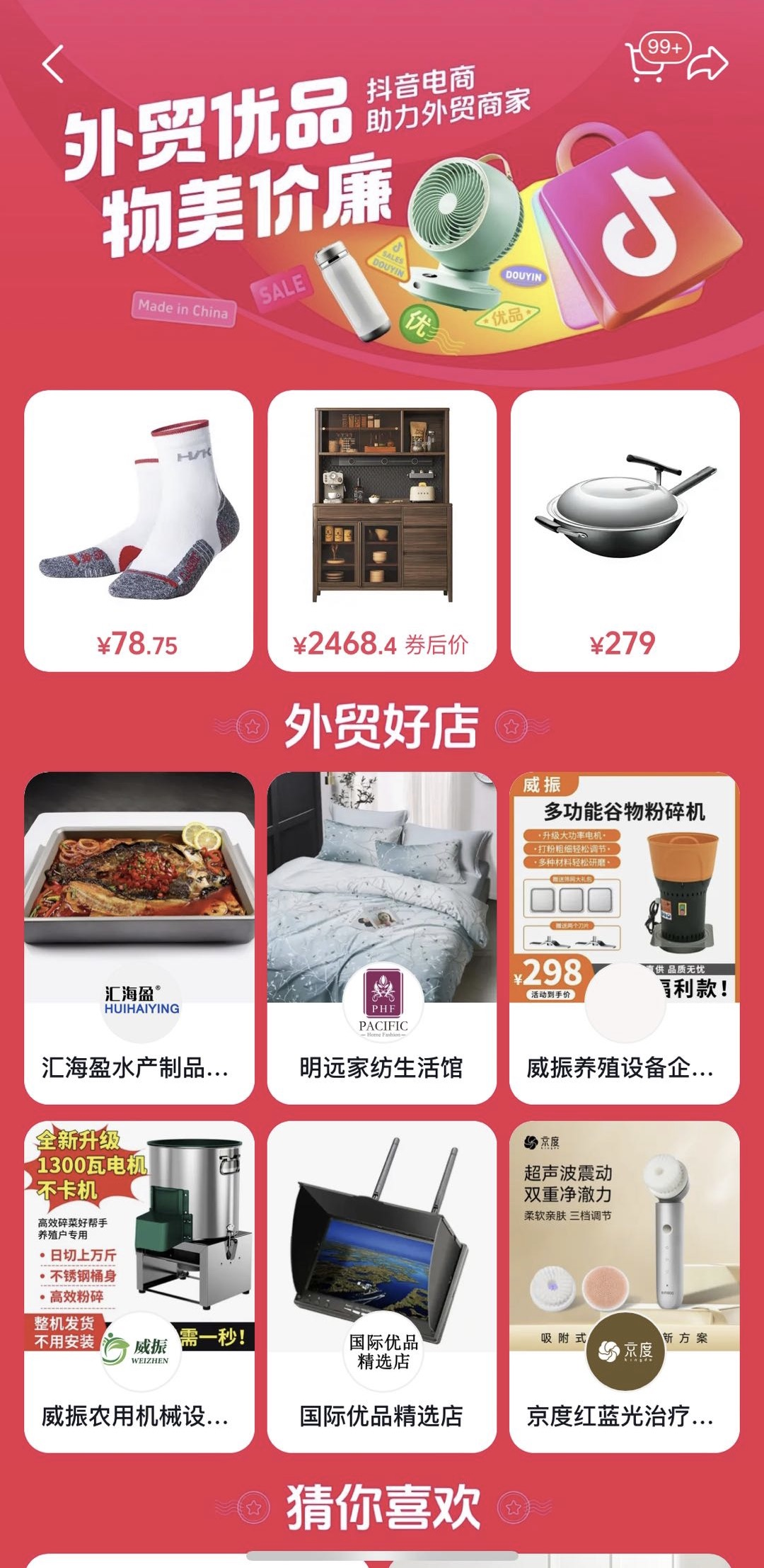 4月16日,抖音集團啓動外貿優品專項扶持計劃,整合電商、生活服務等業務資源,通過開設入駐綠色通道、專項流量扶持、佣金減免降費、免息貸款助力週轉等措施,幫助外貿商家降低經營成本、拓展國內市場。