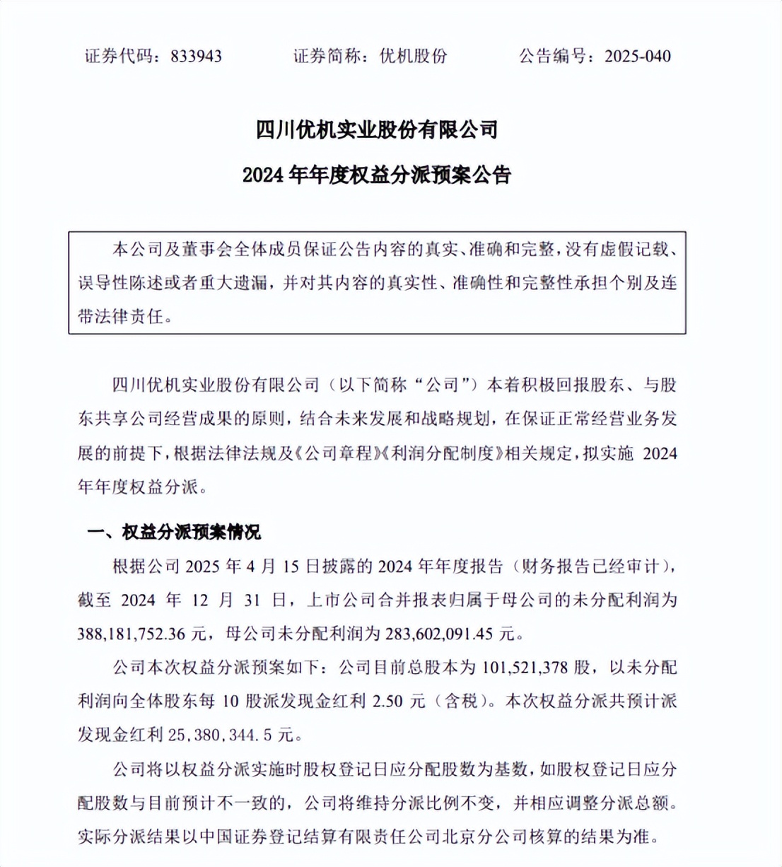 【環球網財經綜合報道】近日,優機股份(833943)正式披露2024年年度報告,實現全年營業收入9.69億元,同比增長8.45%;歸母淨利潤達7,791.87萬元,同比增長4.41%,連續三年實現收入與利潤雙增長,創歷史新高。公司同步宣佈向全體股東每10股派發現金紅利2.50元(含税),權益分派總額約2,538.03萬元。