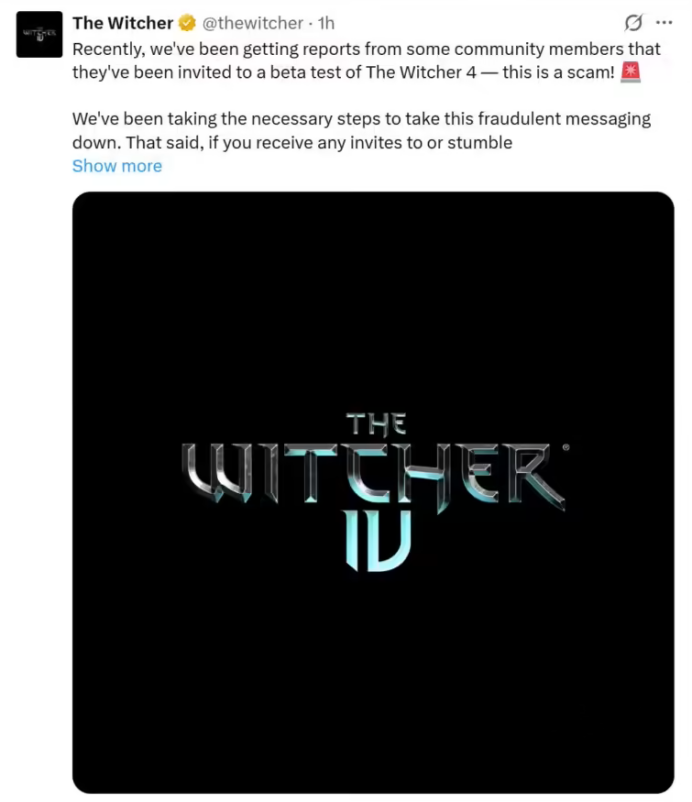 【環球網科技綜合報道】4月17日消息,備受玩家關注的《巫師》系列遊戲開發工作室CD Projekt Red(簡稱CDPR)近日在社交媒體平台X上發文警告稱,近期有部分玩家收到的所謂《巫師4》遊戲測試版的邀請,均為騙局,提醒廣大玩家切勿上當受騙。