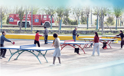 湖北省十堰市,市民在體育運動公園裏打乒乓球。
