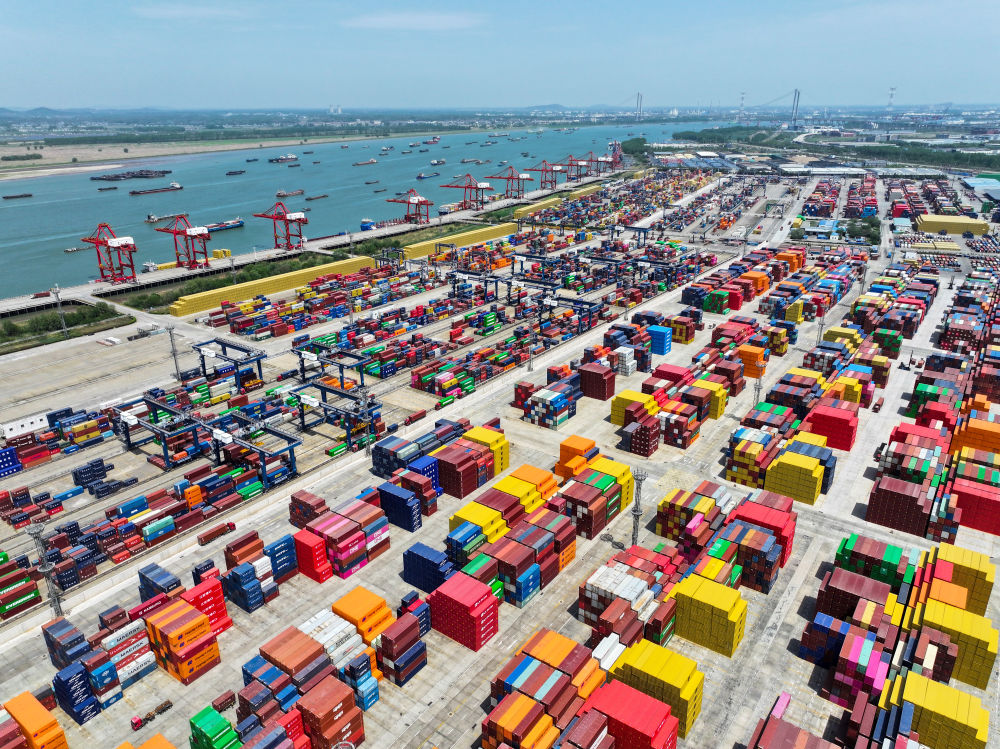 4月16日拍攝的江蘇省港口集團南京港龍潭港區集裝箱碼頭(無人機照片)。新華社發(方東旭攝)