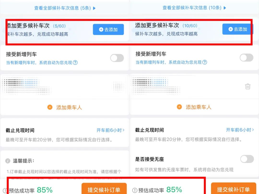 候補5車次和10車次的成功率都為85% 來源:12306App截圖