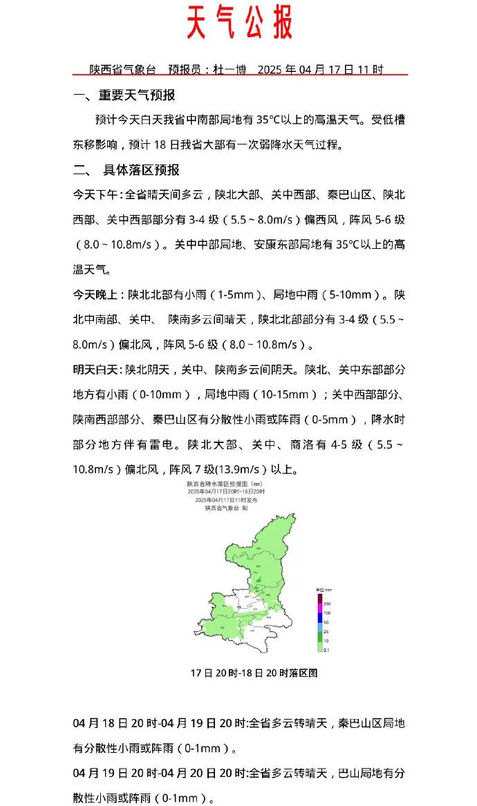 除此之外,陝西省氣象台2025年04月17日10時發佈未來24小時災害性天氣預報:預計今天白天到晚上陝北大部、關中北部和西部部分、陝南西部部分、秦巴山區有4-5級偏南風,陣風可達6級以上。陝北東部、關中東部、陝南東部部分地方有揚沙或浮塵。提請相關地區密切關注天氣形勢,注意防範氣象災害及次生災害,及時發佈預警信號。