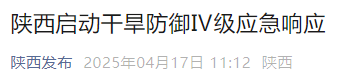 4月17日,據陝西發佈消息,4月以來,全省平均降雨量較多年均值偏少八成,大型水庫蓄水量環比減少。陝北中東部、關中西部和東部、陝南中部等部分區域出現輕度乾旱,其中陝北中部、關中中部局地中度乾旱,抗旱形勢嚴峻。為保障人民羣眾生活生產用水需求,省水利廳於4月16日8時啓動全省乾旱防禦Ⅳ級應急響應。