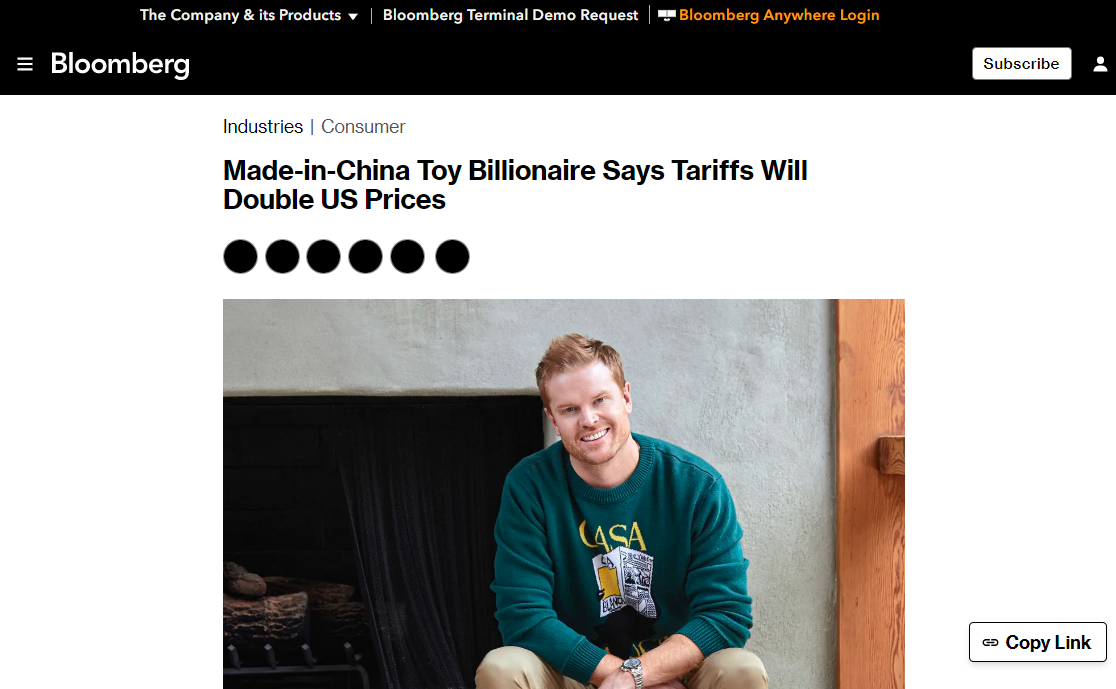 “以目前的關税水平來看,至少玩具的零售價格會翻倍。”莫佈雷説,“我們和大多數競爭對手的處境一樣,因為80%的玩具都是在中國製造的。美國政府可能會從全美各地的家庭和孩子們手中‘偷走聖誕節’。”