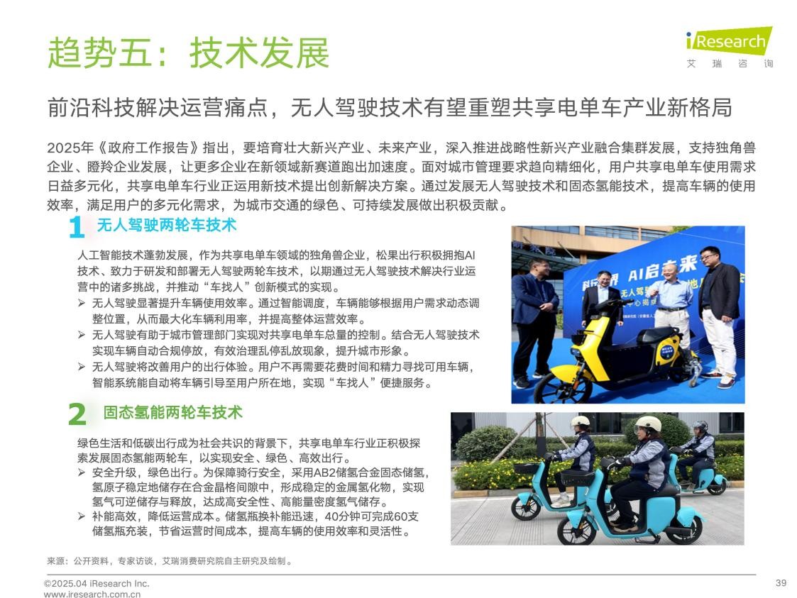 共享電單車行業的未來發展離不開技術創新。《報告》預測,行業未來將聚焦於車輛智能化、能源可持續化和運營精細化等方面,其中無人駕駛技術或將重塑產業格局。現階段,松果出行正在安徽合肥開展無人駕駛兩輪車規模化應用示範項目,未來有望大幅提升車輛使用效率,並幫助城市管理部門實現對車輛總量的控制,且通過自動合規停放,有效治理亂停亂放現象,提升城市形象。