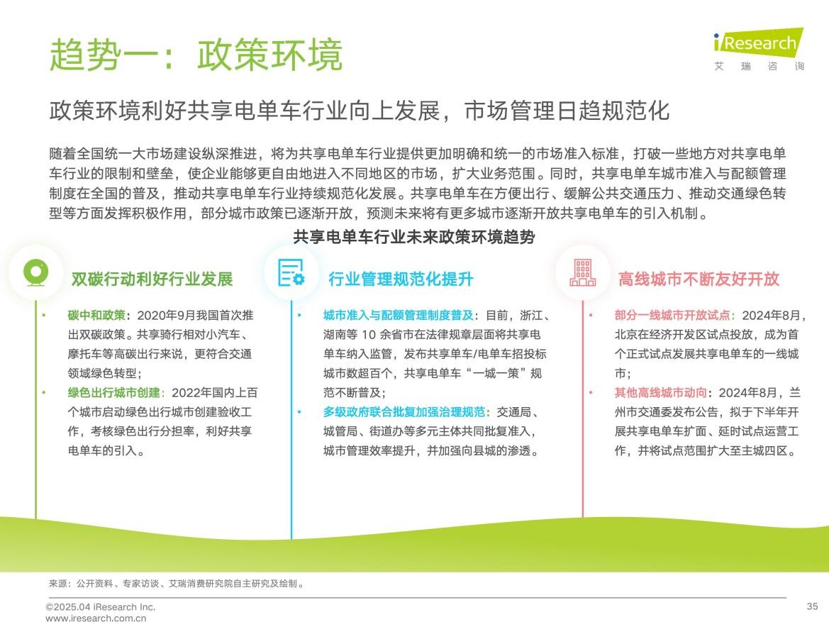2025年《政府工作報告》指出,要縱深推進全國統一大市場建設。加快建立健全基礎制度規則,破除地方保護和市場分割,打通市場準入退出、要素配置等制約經濟循環的卡點堵點,這對於共享電單車行業發展來説,地域壁壘將有望進一步被打破,市場準入標準更加明確和統一,營商環境持續向好。