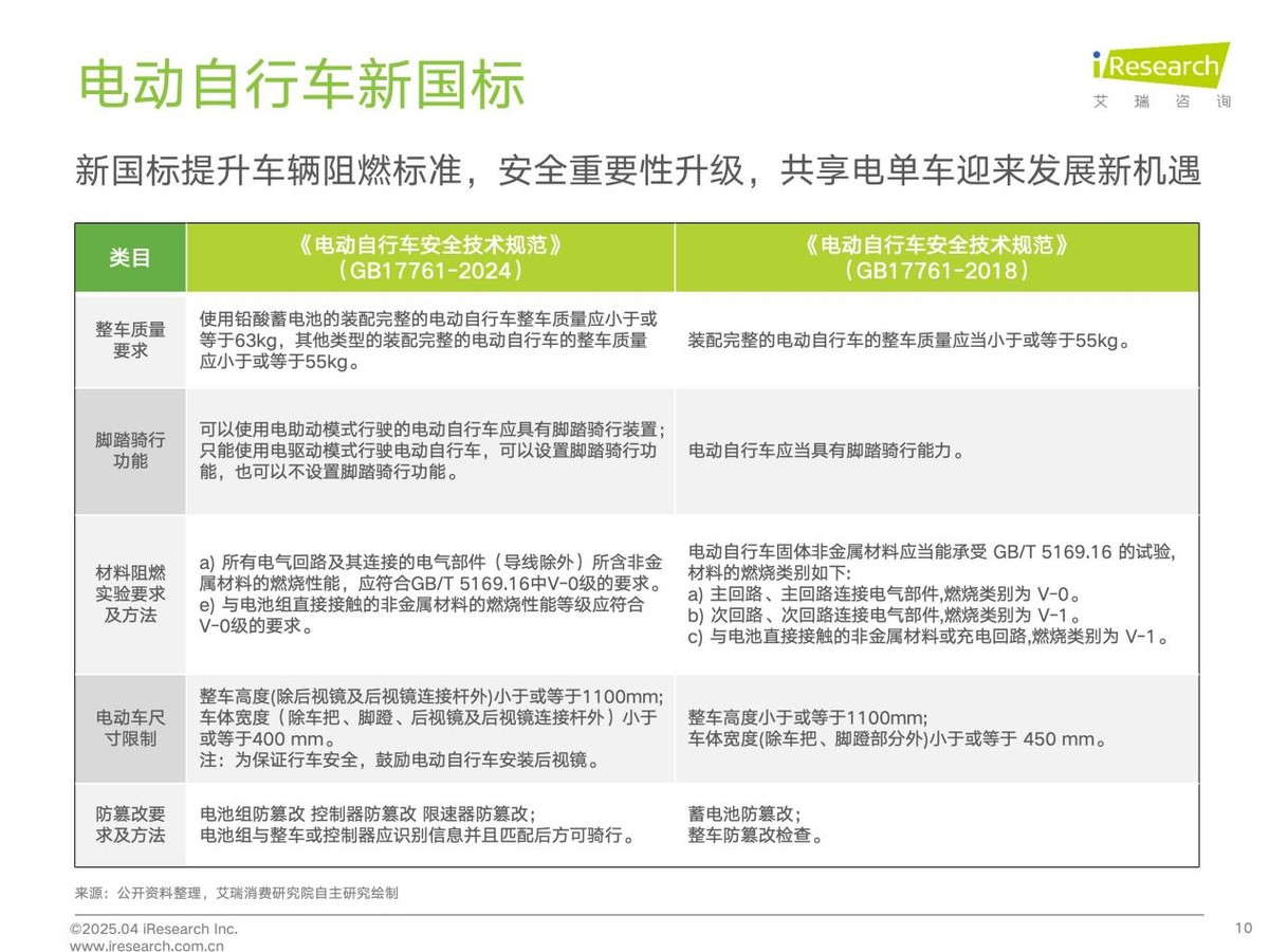2025年,電動自行車新國標正式實施,對車輛的生產製造提供了更高的要求,包括車速限制、阻燃標準和智能化水平等,這為共享電單車行業發展帶來了新的挑戰與機遇。《報告》指出,行業面臨新老車型迭代壓力,新國標將加速行業洗牌,推動企業快速響應政策需求,升級車輛技術,具備智能製造能力的企業將主導市場。