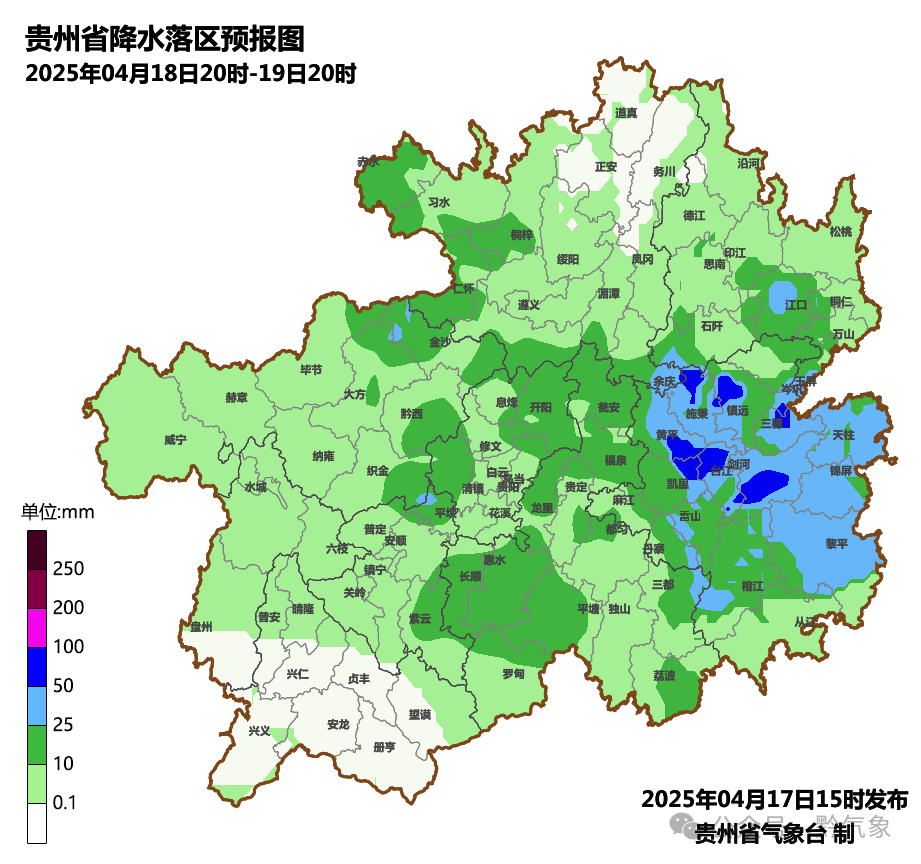 18日傍晚到19日白天,全省陰天間多雲有陣雨或雷雨,中東部局地有中到大雨,個別鄉鎮有暴雨,畢節市東部、安順市東部、貴陽市、遵義市中南部、銅仁市、黔南州、黔東南州局地在雷雨中伴有短時強降水、冰雹、雷暴大風等強對流天氣;