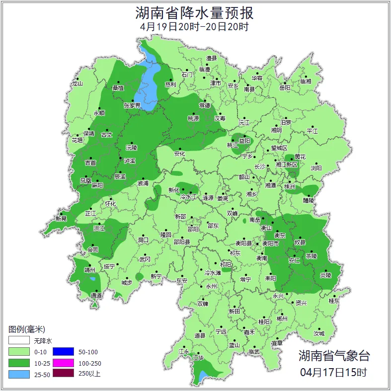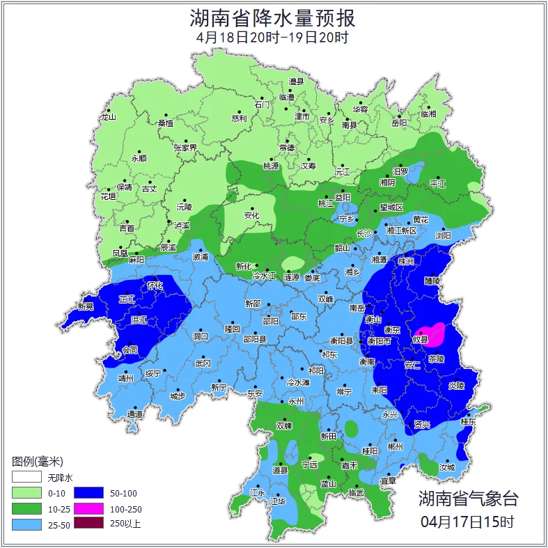 據氣象部門預報:17日晚至19日省內自北向南有一次較強降雨過程,其中18日湘中以南部分地區有暴雨、局地大暴雨,並伴有雷暴大風等強對流天氣;20日西南暖濕氣流加強,雨帶北推,湘西北局地大雨。