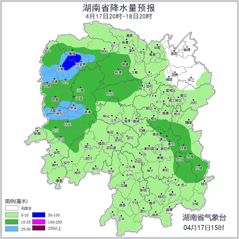 具體預報為:17日晚上至明天白天,湘西北多雲轉中等陣雨或雷陣雨,其中湘西州北部、張家界局地大到暴雨。