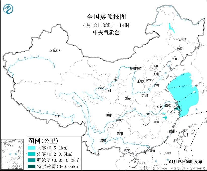 預計,4月18日白天至夜間,黃海中部和南部海域、東海北部海域、長江口及杭州灣附近海域、舟山羣島附近海域、青島港、上海港、寧波港將有大霧;此外,4月18日早晨至上午,安徽南部、江西東部、浙江西部、黑龍江西部、內蒙古東北部等地的部分地區有能見度不足1公里的大霧,局地有能見度不足500米的濃霧。