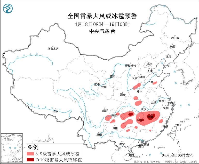 預計4月18日08時至19日08時,西南地區東部、江漢、江南以及河南西北部、山東南部等地的部分地區將有8級以上雷暴大風或冰雹天氣,其中,湖南中部和西北部、江西中北部等地的部分地區將有10級以上雷暴大風,最大風力可達11級以上;西南地區東部、江南等地的部分地區將有小時雨量大於20毫米的短時強降水天氣,其中,湖南中北部、江西中北部、貴州東南部等地的部分地區小時雨量大於50毫米,最大可達60毫米以上。