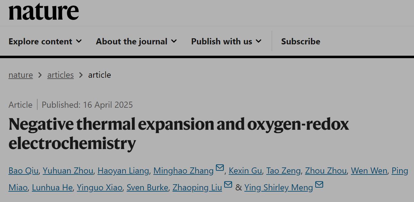 近日,相關研究成果以《電池材料的氧活性與負熱膨脹性》(Negative thermal expansion and oxygen-redox electrochemistry)為題,發表在《自然》(Nature)上。