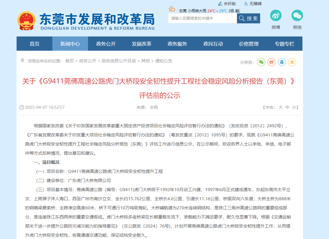 公告顯示,項目實施範圍內,總投資約15.5億元,擬在廣州南沙區和東莞虎門鎮對莞佛高速公路虎門大橋段既有道路及橋樑實施安全韌性提升,項目建設不涉及新增用地用海,建設內容包括部分橋樑構件養護、橋面鋪裝更換、交安機電設施升級改造、過江段橋樑耐久性處置等,全面提升全線結構物安全韌性。預計2025年10月開工,2027年12月完工。工程施工工期為27個月,其中封閉道路施工12—15個月,屆時道路將會封閉施工。