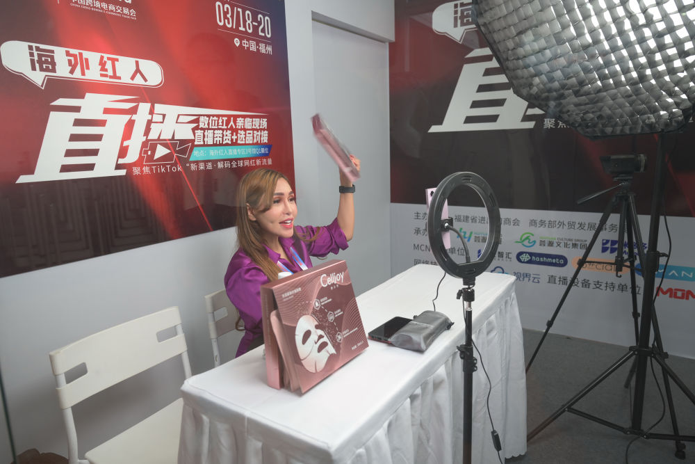 2024年3月18日,一名馬來西亞主播在福建福州舉行的第四屆中國跨境電商交易會展會現場直播帶貨。