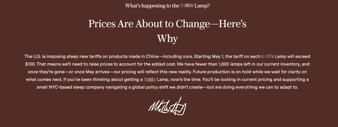 △馬修·哈塞特在其企業產品網站發佈的關税影響公告:美國正對中國生產商品加徵關税,我們的產品也在其中。從5月1日起,我們所出售的枱燈每盞都會被加徵超100美元的關税。這意味着我們需要為額外的支出漲價。我們當前庫存中還有不到1000盞枱燈,一旦售罄或5月到來,我們的商品價格將反映新的現實。