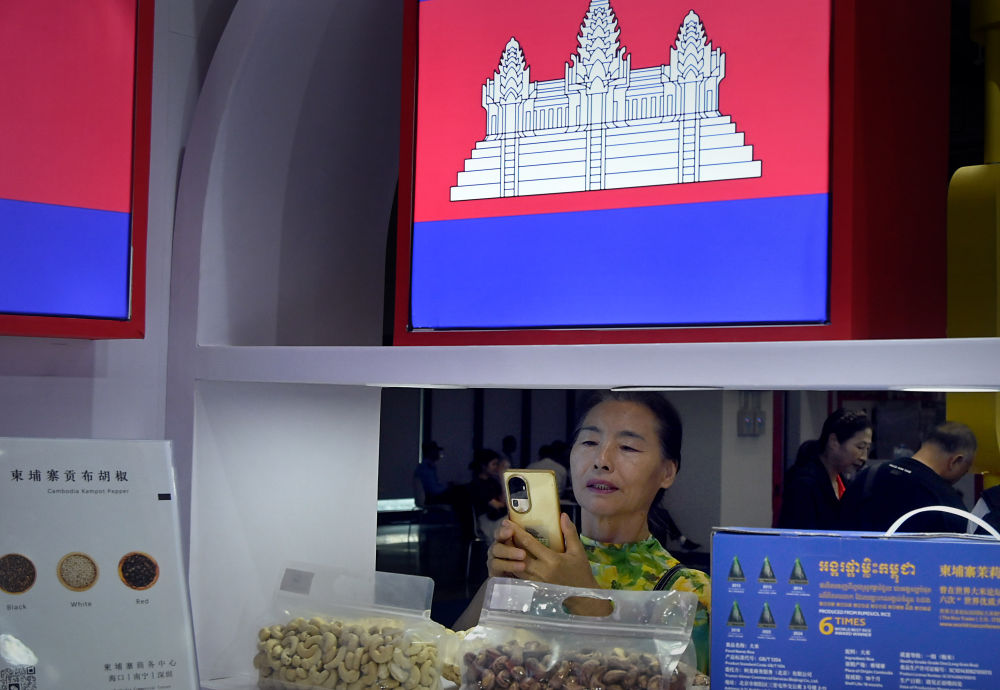 ↑4月17日,在消博會4號館的柬埔寨展區,一位市民在拍攝展台上的腰果產品。王頌 攝