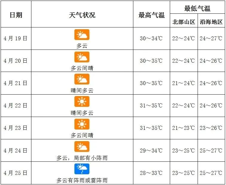 4月19日-23日,全市多雲到晴,氣温逐日上升,最高氣温30~35℃;