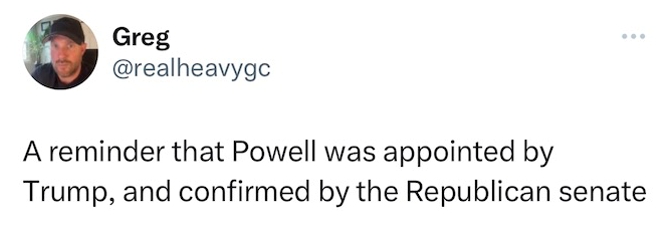 “提醒一下,鮑威爾(最早)是由特朗普任命、經國會參議院表決批准上任的。”↓