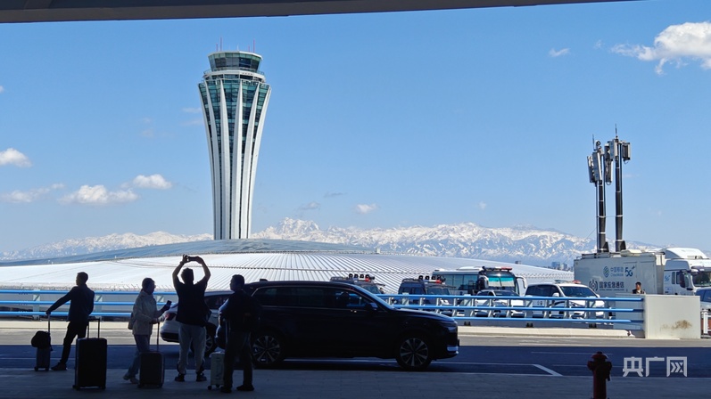 在北航站區新航站樓前拍照留念的旅客 (央廣網記者郭璁悦 攝)