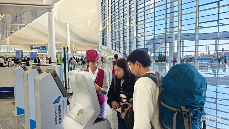 南航工作人員幫助外國遊客值機 (央廣網記者郭璁悦 攝)