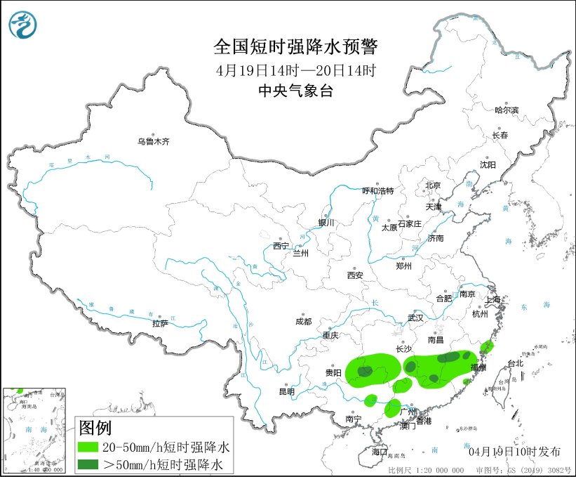 預計4月19日14時至20日14時,貴州東南部、湖南南部、江西中南部、福建西部和北部等地的部分地區將有8級以上雷暴大風或冰雹天氣,其中,江西東部、福建西部等地的局地將有10級以上雷暴大風;貴州東南部、湖南中南部、江西中南部、福建、廣西北部和東部、廣東北部和西部等地的部分地區將有小時雨量大於20毫米的短時強降水天氣,其中,湖南南部、江西東南部、福建中部等地的部分地區小時雨量大於50毫米,最大可達70毫米以上。