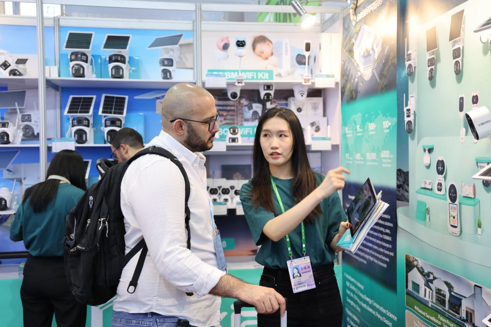 4月15日,客商在廣交會上選購安防產品。新華社記者 盧漢欣 攝