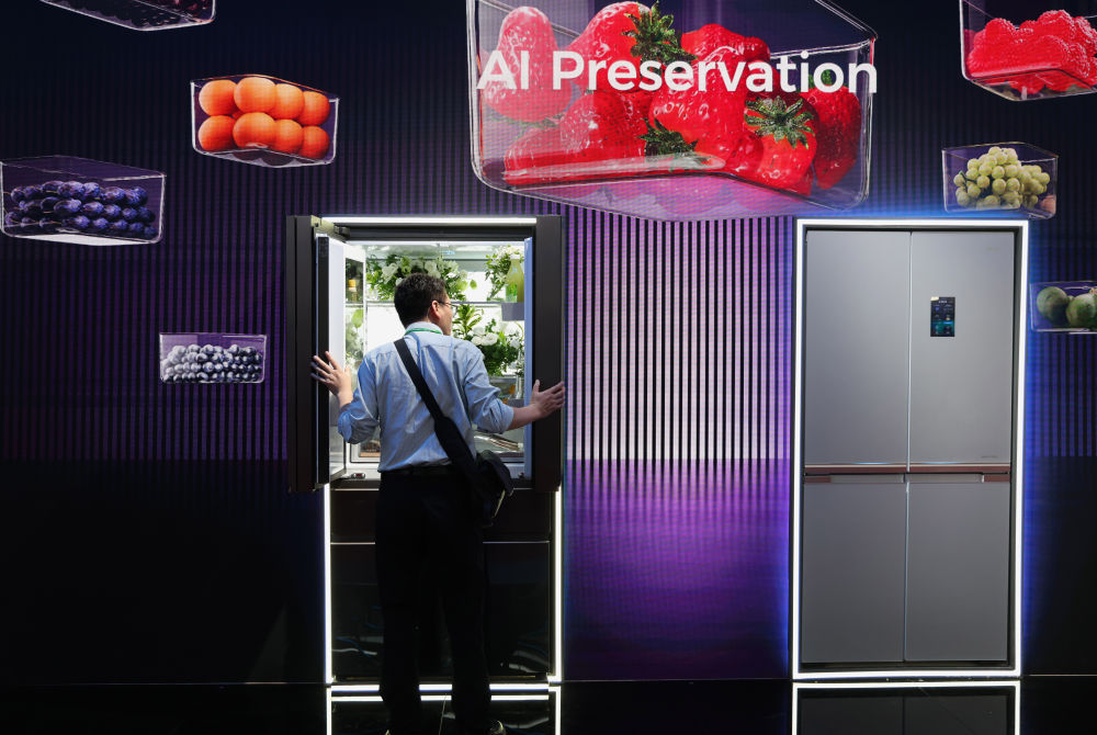 4月16日,客商在廣交會上參觀瞭解一款智能冰箱。新華社記者 盧漢欣 攝
