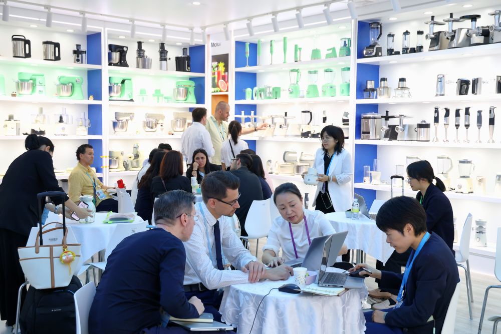 4月15日,一名境外採購商(中)在一家電器公司的展區洽談選購。新華社記者 劉大偉 攝