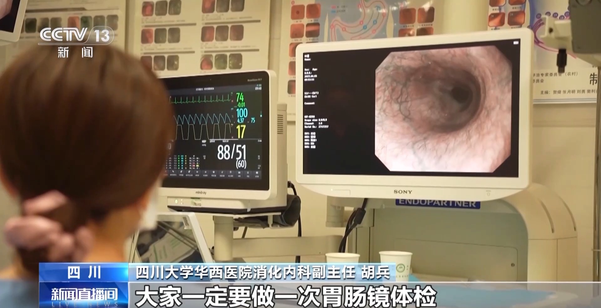 *四川大學華西醫院消化內科副主任 胡兵:*比方説消化道腫瘤引起消化道的梗阻,引起消化道出血或者是疼痛,這個時候一檢查往往都是晚期進展期了。因此我們到45歲以後,一定要做一次胃腸鏡體檢,要進行一個篩查。早期我們通過內鏡微創的治療,治癒率可以達到90%以上。