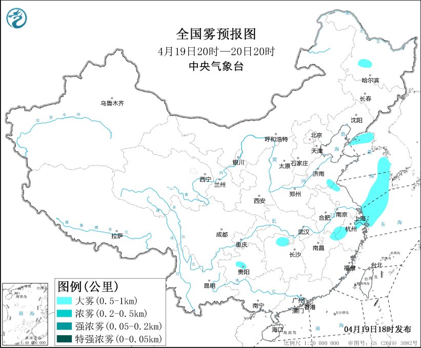 預計,4月19日夜間至20日白天,黃海北部海域、黃海中東部和南部海域、東海西北部海域、遼東半島東部沿岸海域、長江口及杭州灣附近海域、舟山羣島附近海域、上海港、寧波港將有能見度不足1公里的大霧。