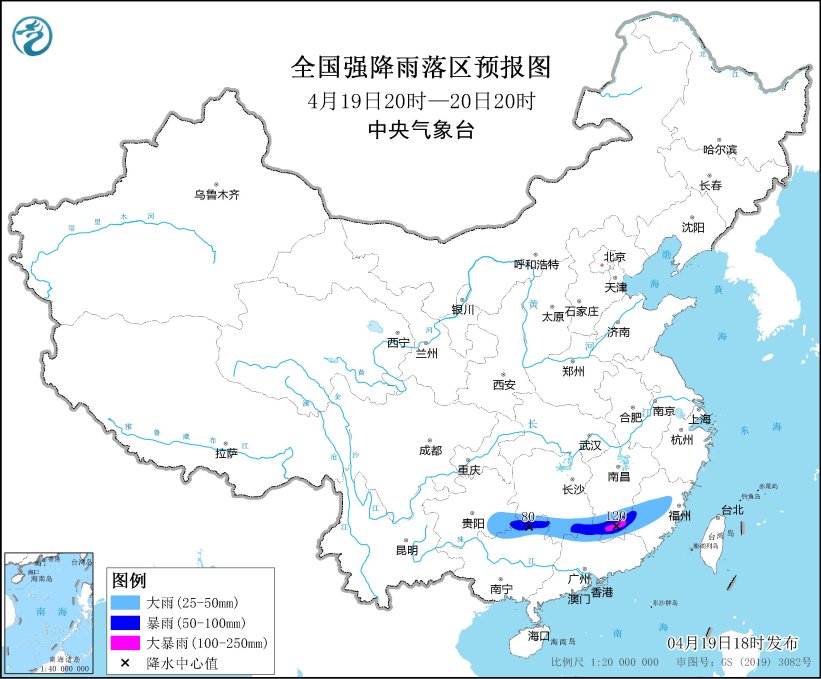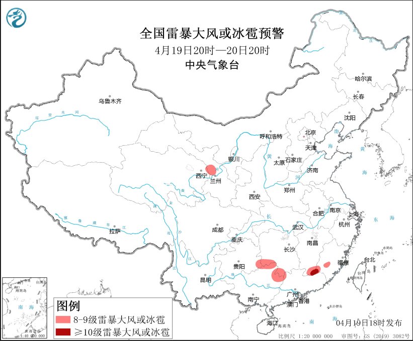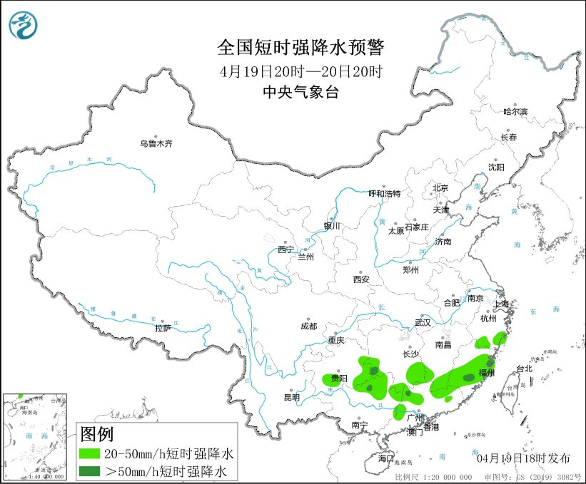 預計4月19日20時至20日20時,貴州東南部、湖南西南部、廣西東北部、江西南部、廣東東北部、福建西南部等地的部分地區將有8級以上雷暴大風或冰雹天氣,其中,江西南部、廣東東北部等地的局地將有10級以上雷暴大風;貴州南部、湖南西部和南部、江西南部、浙江南部、福建、廣西北部和東部、廣東中北部等地的部分地區將有小時雨量大於20毫米的短時強降水天氣,其中,湖南西南部、廣西北部、廣東北部、福建東部等地的部分地區小時雨量大於50毫米,最大可達60毫米以上。