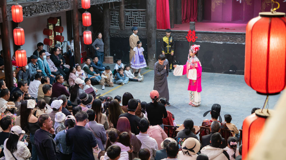 穿過浪漫的法式田園,來到景區的水墨古村,又是另一番中式風情。記者探訪時,古戲台正在上演一出古風話劇《不折風骨》,可容納近400人的院子裏座無虛席。不少小朋友在前排席地而坐,演員們走到人羣中,與觀眾零距離互動,將故事娓娓道來。