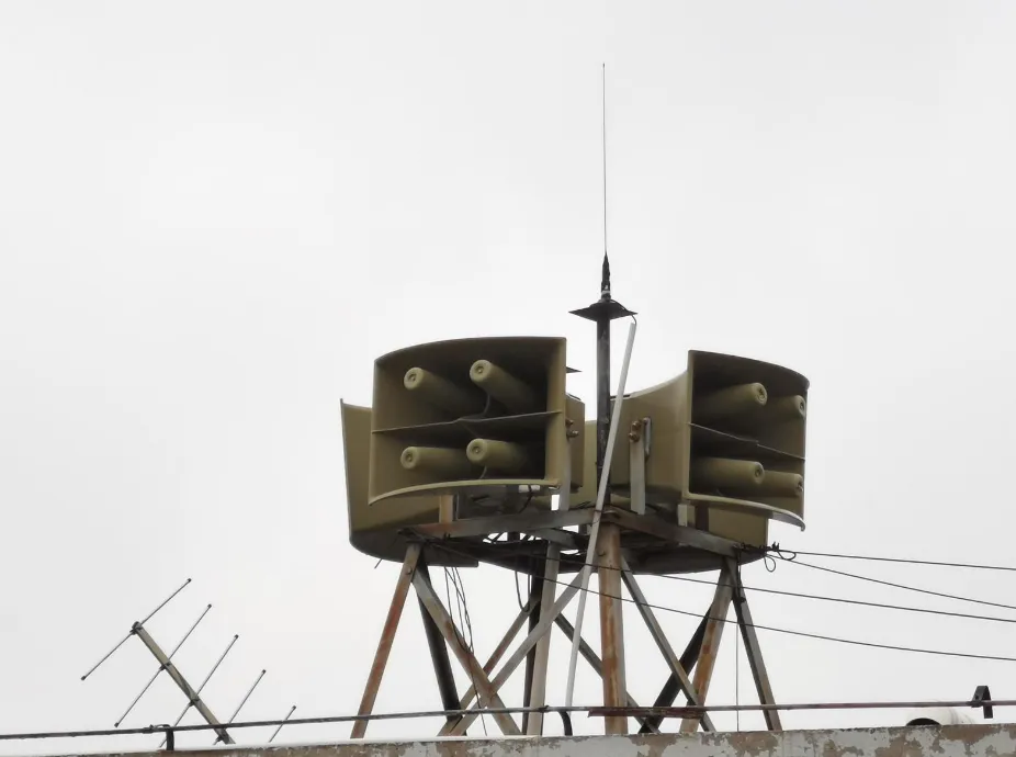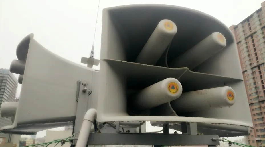 ▲固定式警報器:放置於瀋陽多處建築物的頂層,警報器是“組合式”,四面都有揚聲器。